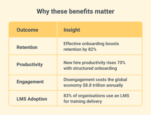 Onboarding is a critical stage in the employee lifecycle. Research consistently shows that a well-structured onboarding programme improves retention, boosts confidence, and accelerates time-to-productivity.